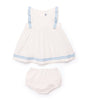 White Dress with Blue Embroidered Ruffle and Bloomers