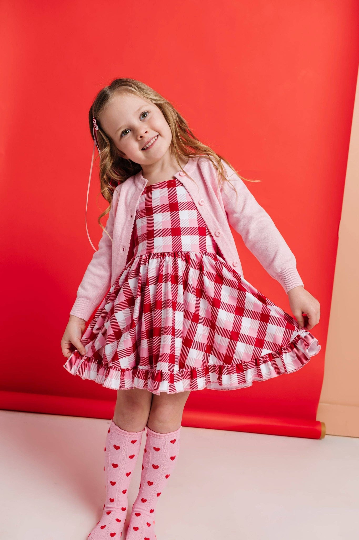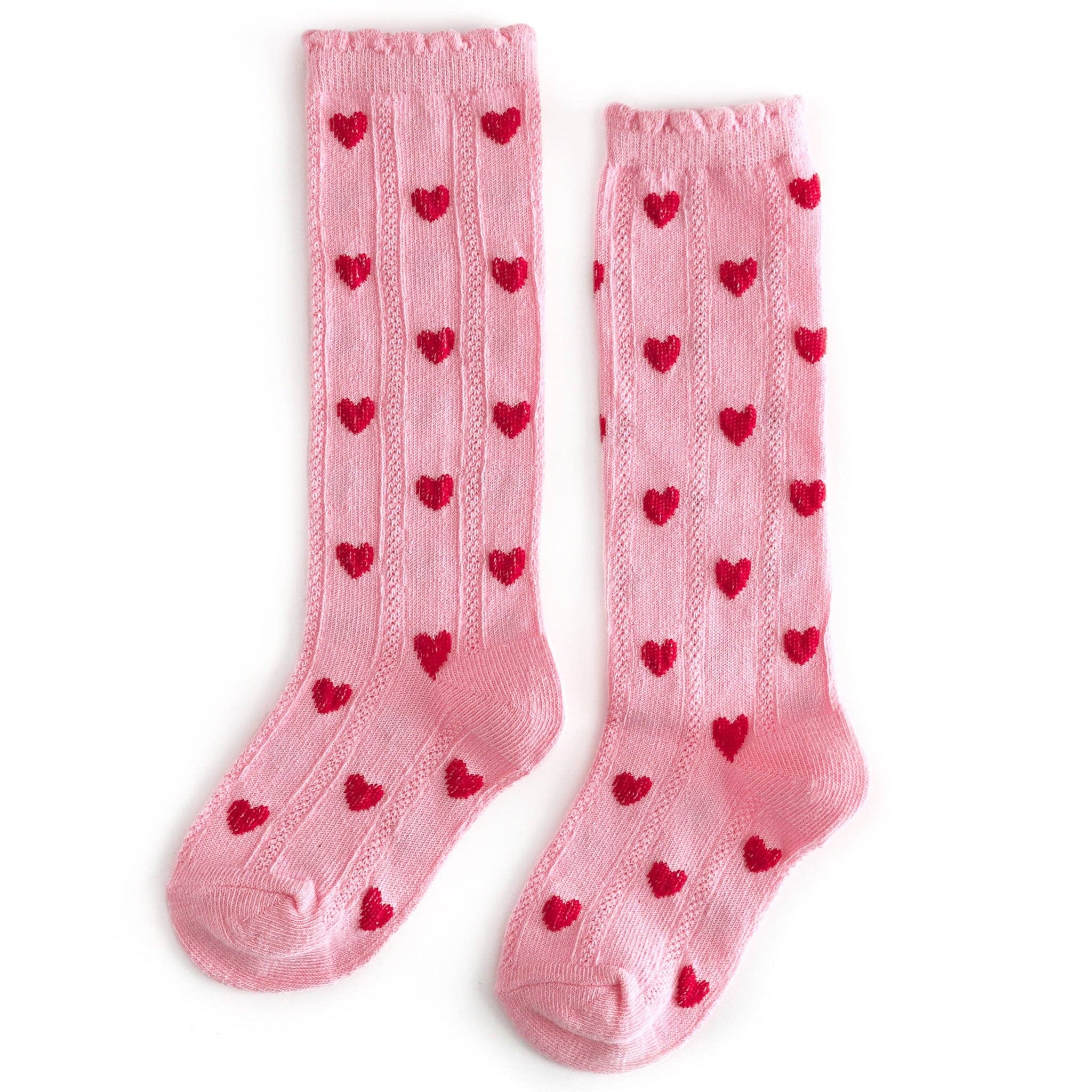 True Love Scalloped Knee High Socks Blossom Pink Sock with Red heart design.