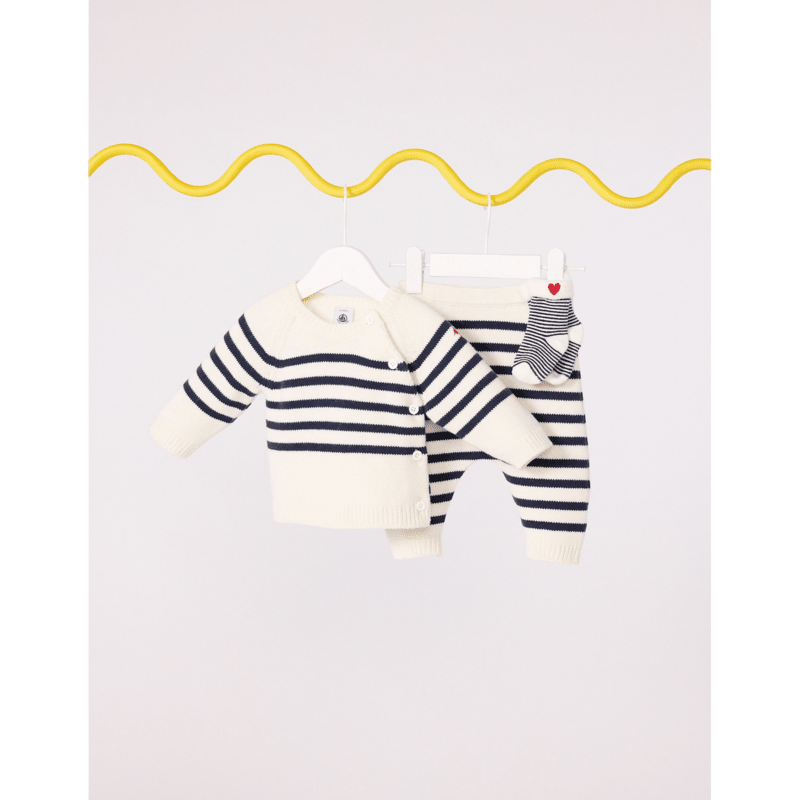 Petit Bateau white with navy stripes sweater and trousers set crafted from the softest wool-cotton blend. Features sailor-ready stripes – ready to help their imaginations set sail.