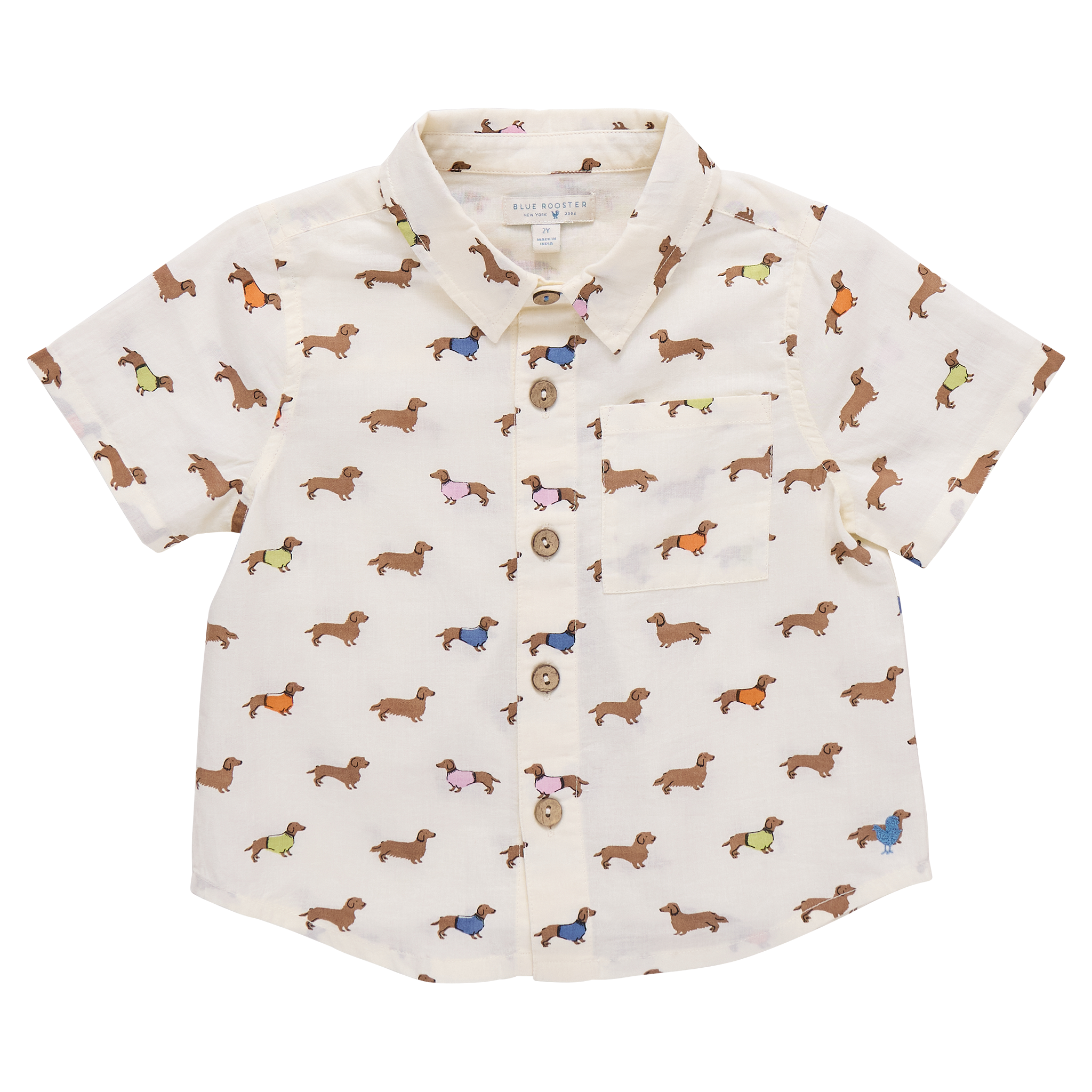 - A playful classic with a pup filled twist! The Boys Jack Shirt features our dachshunds in sweaters print on soft 100% cotton cambric. Designed with short sleeves, a front left chest pocket, and finished with wood buttons, this easy button up is perfect for spring celebrations and everyday wear alike.
