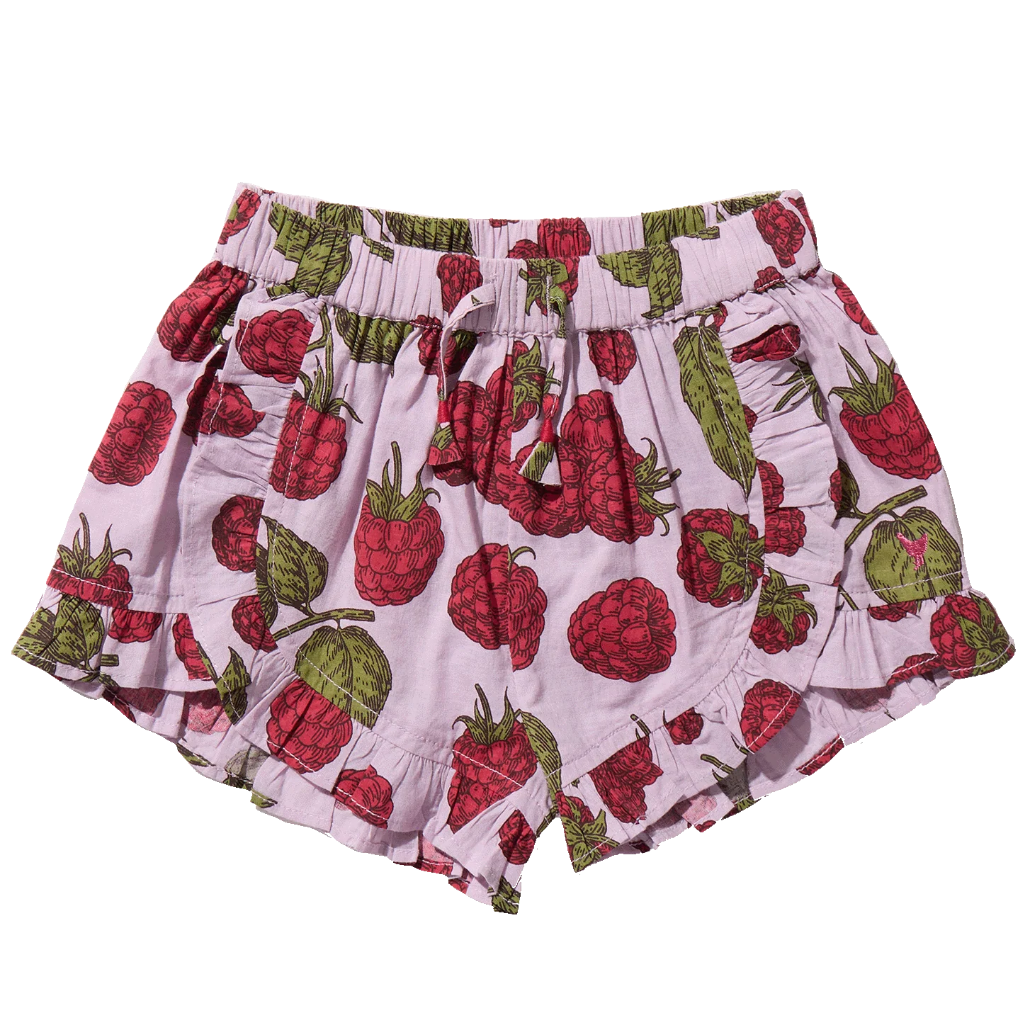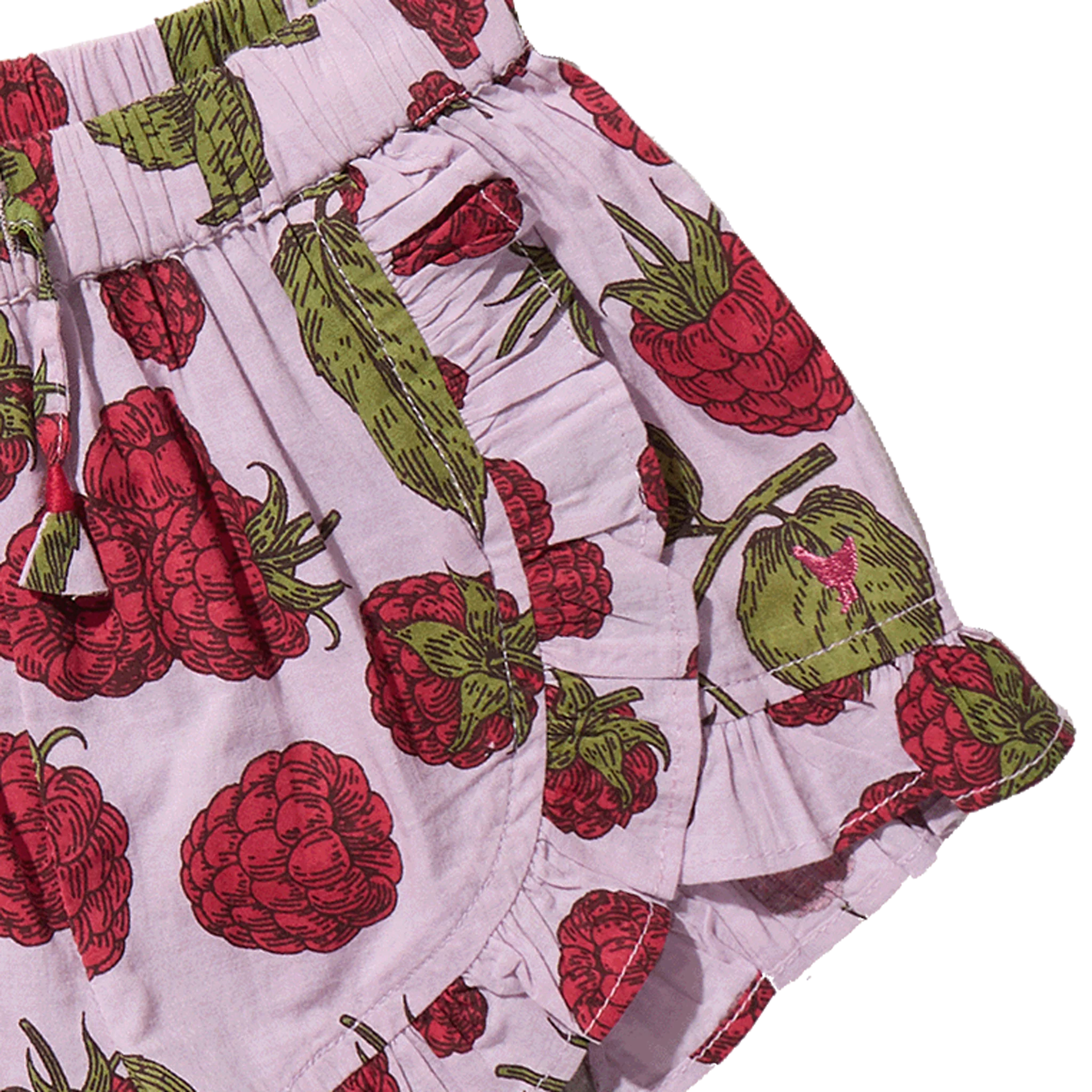 Playful print meets everyday comfort! The Millie Ruffle Short in Lavender Raspberries features a soft elastic waist and flouncy ruffle hem designed for movement and ease. The vibrant fruit print adds cheerful personality while keeping the silhouette polished. Finished with an attached bow at the waist with thread-wrapped ends, it’s a charming piece made for warm-weather adventures.