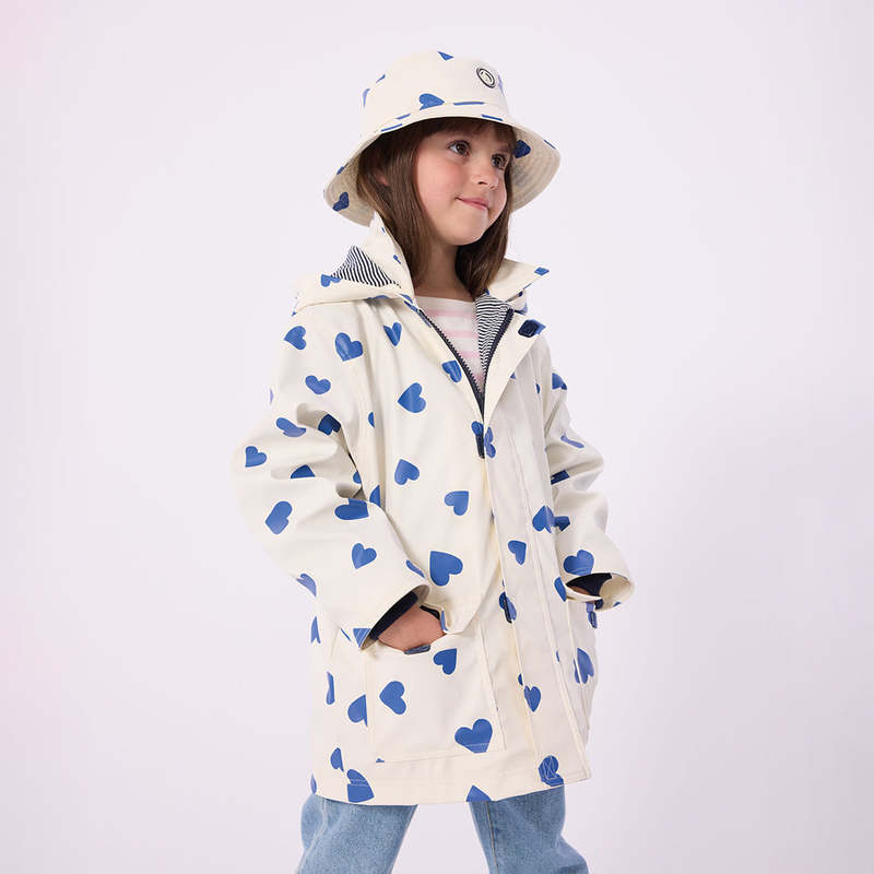 Iconic Petit Bateau bucket rain hat for children. Match with the Petit Bateau heart raincoat for charming rain fashion! Windproof and waterproof. Made from more than 40% recycled polyester.