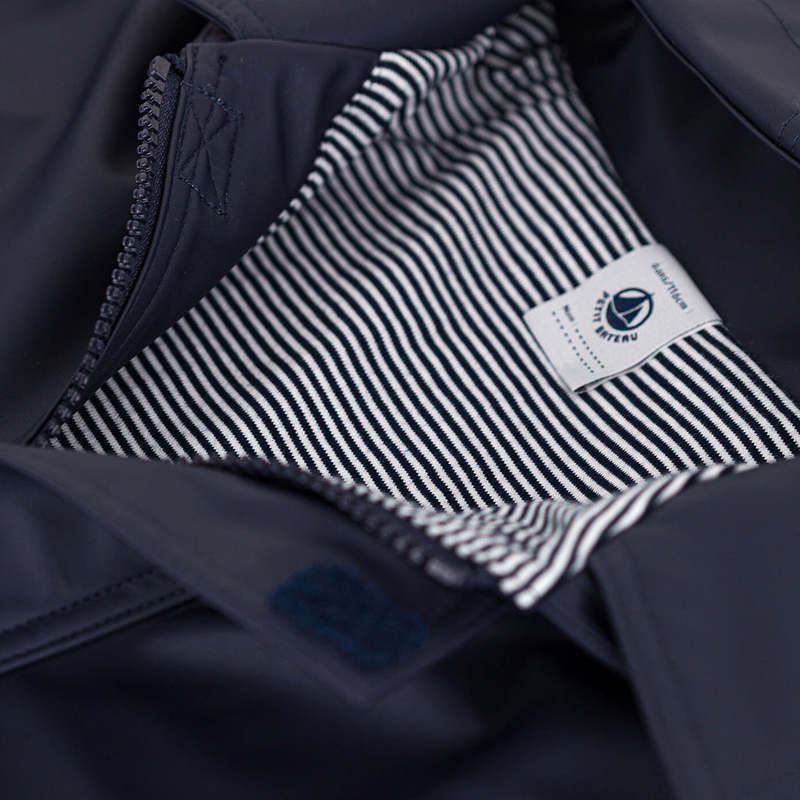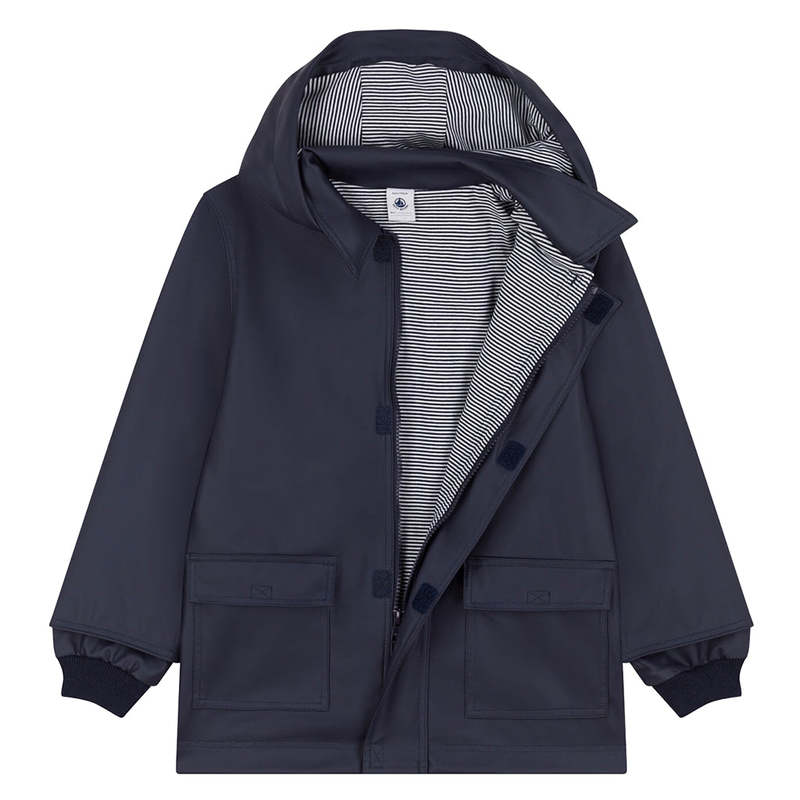 Petit Bateau iconic raincoat. Soft waxed raincoat in navy with cotton jersey lining.