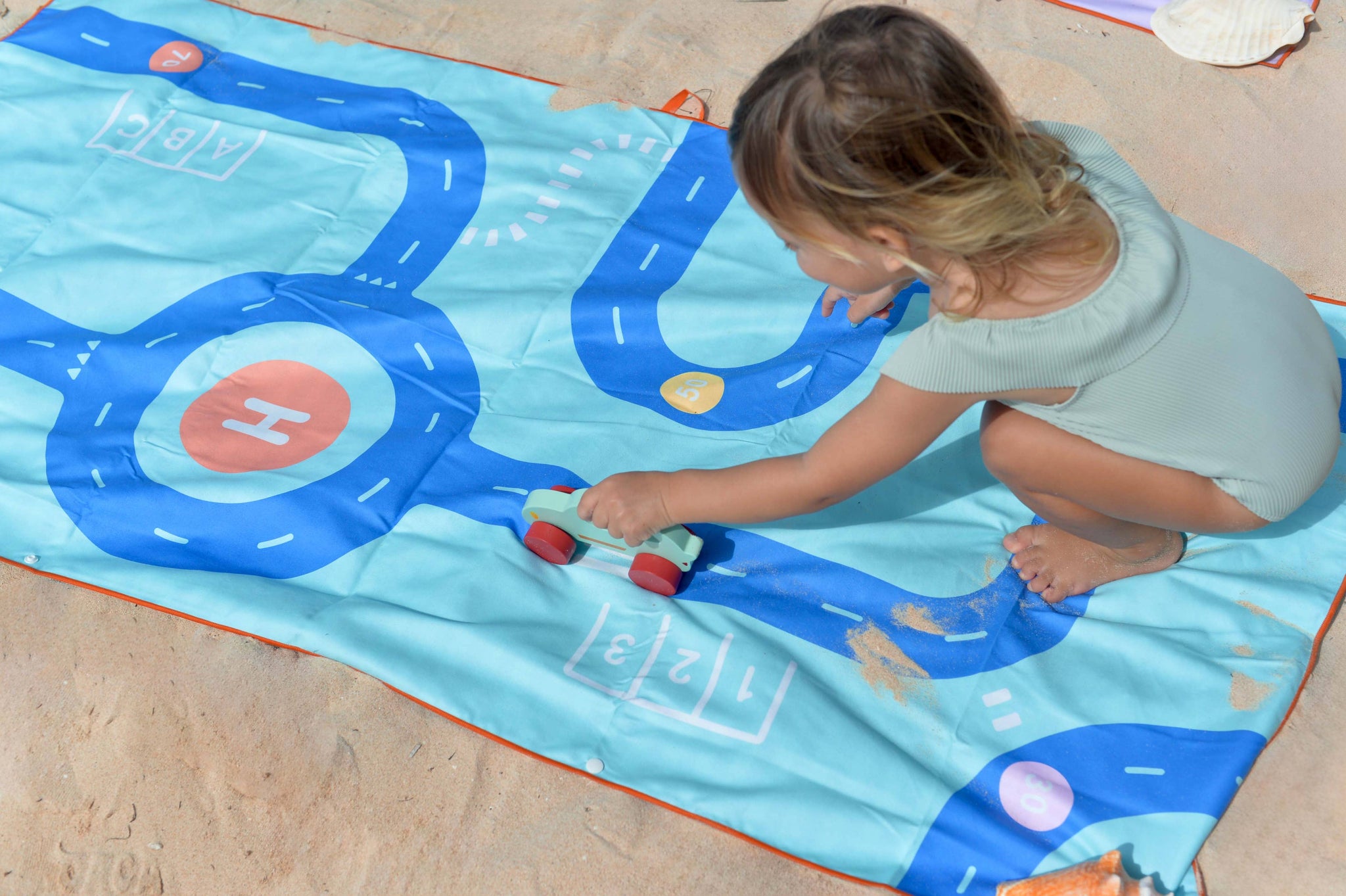 This play towel features a unique design and two sides. On the front, there’s a game, and on the back, you’ll find a graphic pattern.